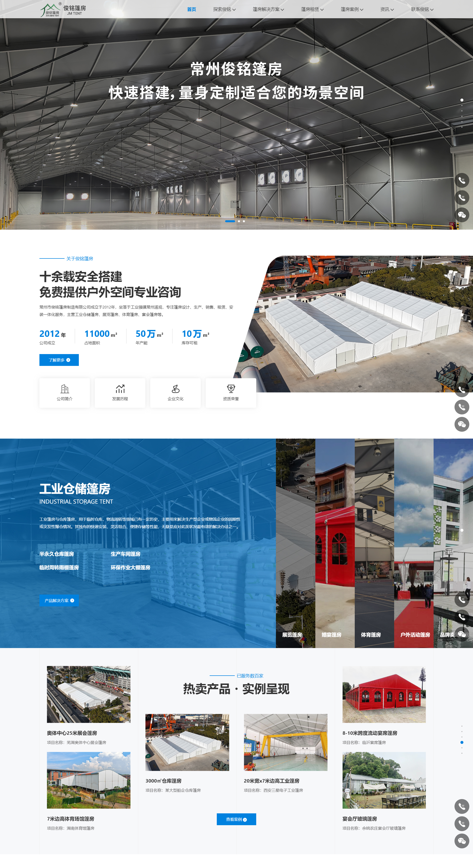 常州市俊铭篷房制造有限公司成立于2012年,坐落于工业强镇常州遥观,专注篷房设计、生产、销售、租赁、安装一体化服务,主营工业仓储篷房、展览篷房、婚宴篷房、体育篷房、户外活动篷房、品牌卖场篷房等。